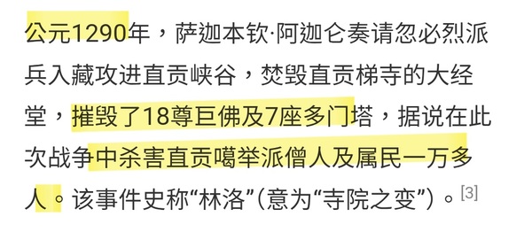 因為地盤劃分的問題,雙方還曾經到忽必烈面前打過官司,結果是薩迦派贏了,止貢派不服氣。
