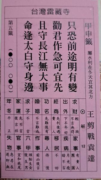 附上2019年初在台雷求的籤詩,當時問2019年運,給的籤。