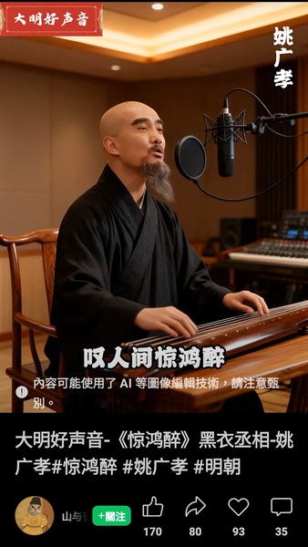 2025年11月中,影音號跑出大明好聲音,AI做成姚廣孝彈古琴唱歌的影片。