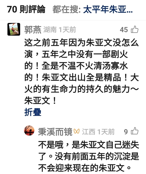 其中一個留言截圖,就是講朱亞文這幾年的沉澱和積累,為啥扯朱亞文?