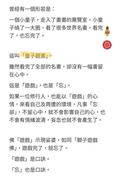「遊戲」是修行的大口訣,一個行者如果以「遊戲」的心看芸芸眾生,再反觀自己,對一切人、事、物,不會執著。