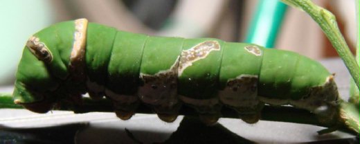 說明一下:幼蟲為了防禦敵人"鳥",在剛孵化時會是像鳥糞一樣的顏色,讓鳥誤以為是大便,等到了比較大的時候,會變成綠綠的,偽裝成樹枝,在身體比較前面的體節會膨大,長出假眼。還會伸出臭角,類似蛇的舌信,還臭臭的,可以嚇退敵人