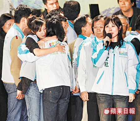 長昌競選總部舞台上,北市議員顏聖冠(右)極力安慰支持者,立委邱議瑩(左三)和北市議員許淑華(左二)則相擁而泣。(蘋果日報2008.3.23)