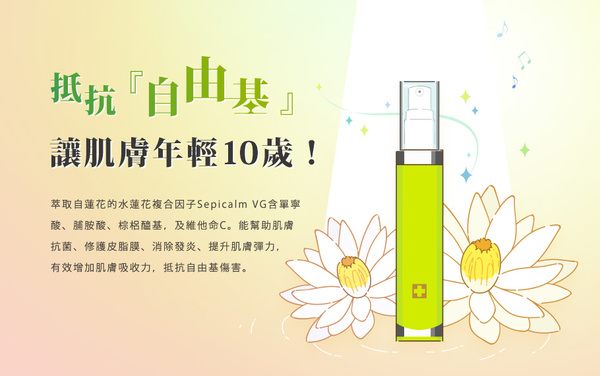 肌膚若缺少活化肌底的驅動因子就可能會加速老化,當皮膚開始出現小細紋、黑斑或肝斑,就要注意是老化的警訊!體內自由基的增生就是造成老化最大的原因,自由基會使結締組織的主要結構(彈力蛋白、膠原等)退化,造成一般皮膚提前老化,水蓮花複合因子 Sepicalm VG 可幫助肌膚抵抗自由基的傷害,富含維他命 C 的特性,能提供肌膚膠原與彈力蛋白新代謝運作時所需的養分,有效提升吸收力,抵禦肌膚老化,找回肌膚活力。