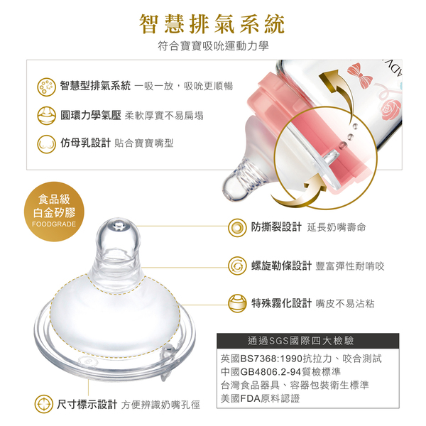 其中奶嘴的「智慧排氣系統」更仿照寶寶吸吮運動力學,一吸一放吸吮起來更順暢,能減少及預防寶寶脹氣的可能性。
