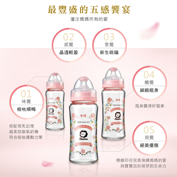 美的事物總是讓人打從心裡喜歡,小獅王辛巴「蘿蔓晶鑽玻璃奶瓶」一推出隨即獲得眾多媽咪的目光!此系列奶瓶發想『來自媽媽的愛』,以花草的生命力,賦予奶瓶新寓意!奶瓶不再只是哺乳瓶,更以萬花生長的姿態,演繹寶寶茁壯萌芽的生命力,灌注媽媽所有的愛,給寶貝享受一場無限祝福的五感饗宴!(視覺-美麗印花、觸覺-圓滑瓶身好握拿、味覺-超柔奶嘴吸吮順暢、感覺-薄透輕盈、意覺-寓意深遠)。