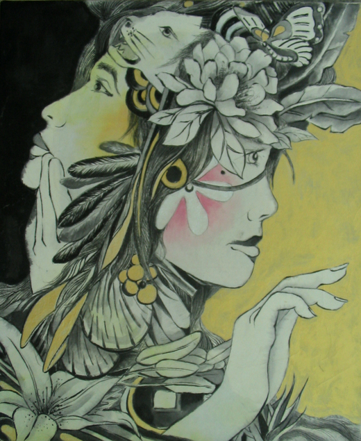 這系列作品筆者並沒有要表現出畫中人物的性別,是男人或是女人在此並不重要,重點在表現出一個人的美、一個人對自己追求理想的自信。由於之前《這些人系列》(圖4-3~5)作品太過強調外顯性別中的象徵物[1],而造成筆者自己本身的刻板印象,《Just beautify》、《Just good》就排除人為的象徵,轉而依植物或動物的特性來轉化對性別的感受,試圖從多元的方式來表現人的美,Just beautify、Just good。