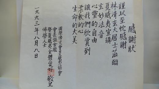 林居士特有的演說家氣質。這也是一場非常成功的演出,給我們這一趟巡迴演講,劃下了完滿的句點,誠如張會長與全體佛光會友送給 林居士感謝狀所說的:「我們僅以致忱感謝,林清玄大居士蒞臨夏威夷演宣講:玄妙法音-心靈自由,讓我們欣賞到,柔軟的心,生命的大美。」 演講會過後,連著的是照相留念,簽名紀念,一樣的熱情,但不一樣的感受,十多天的奔波忙碌,就快要結束了,所謂的聚散隨緣,莫過於此了。
