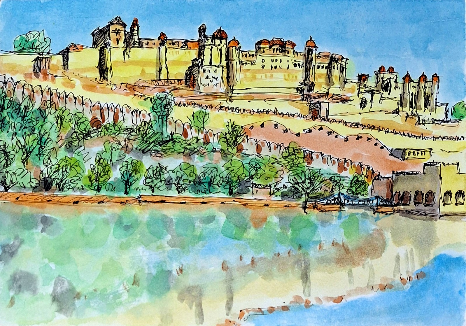 琥珀堡(Amber Fort),坐落於印度齊普爾(Jaipur)郊外的山丘上,如金色長夢般靜靜俯瞰著整座古城。早晨的陽光穿過薄霧,灑在赭紅與淡黃的城牆上,石材泛出一層柔和的光,像被時間親吻過的肌理。遠望那蜿蜒的城道與厚重的城門,彷彿仍能聽見昔日象隊登城的腳步聲與號角迴盪。