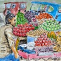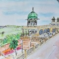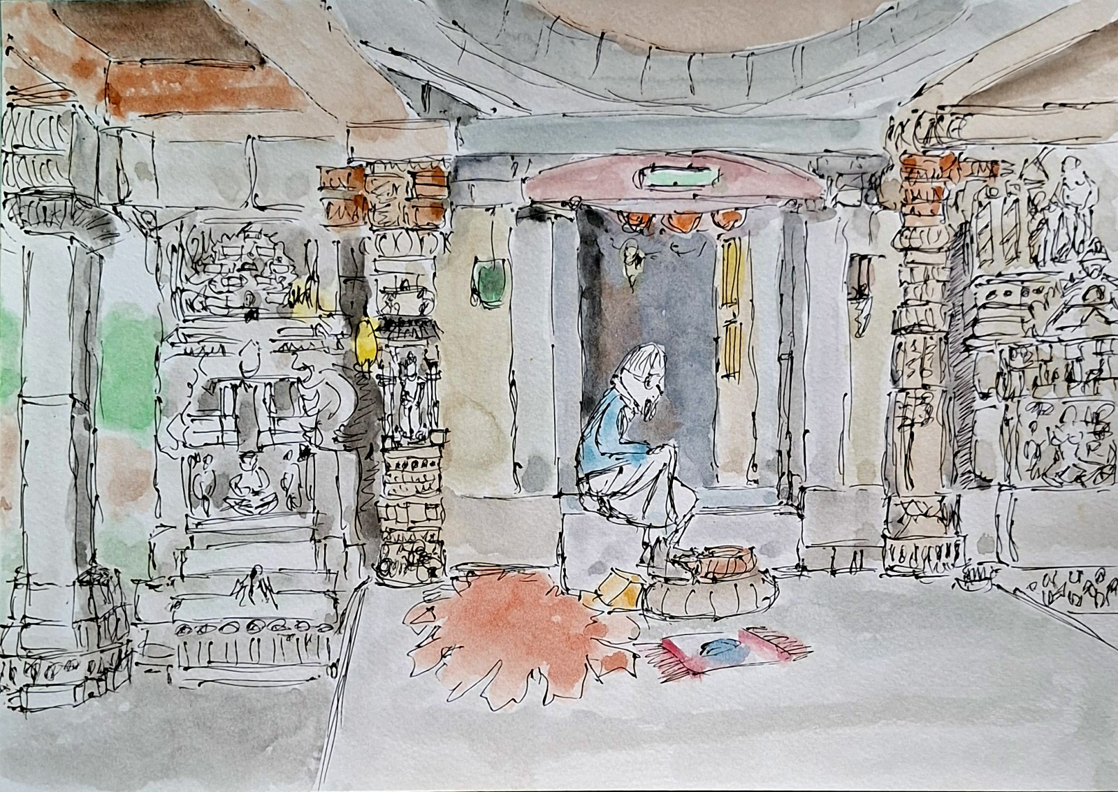 寺廟牆面上雕刻著千年前的神祇與舞者,線條雖被歲月磨蝕,仍保有動感與優雅。幾位旅人坐在階梯上歇息,一邊擦汗、一邊驚嘆這座建於沙石之上的奇蹟。風吹過拱門,帶起一片花瓣,落在供桌前的油燈上,微光閃爍,像是神祇在眨眼,守護著每一個帶著願望而來的人。