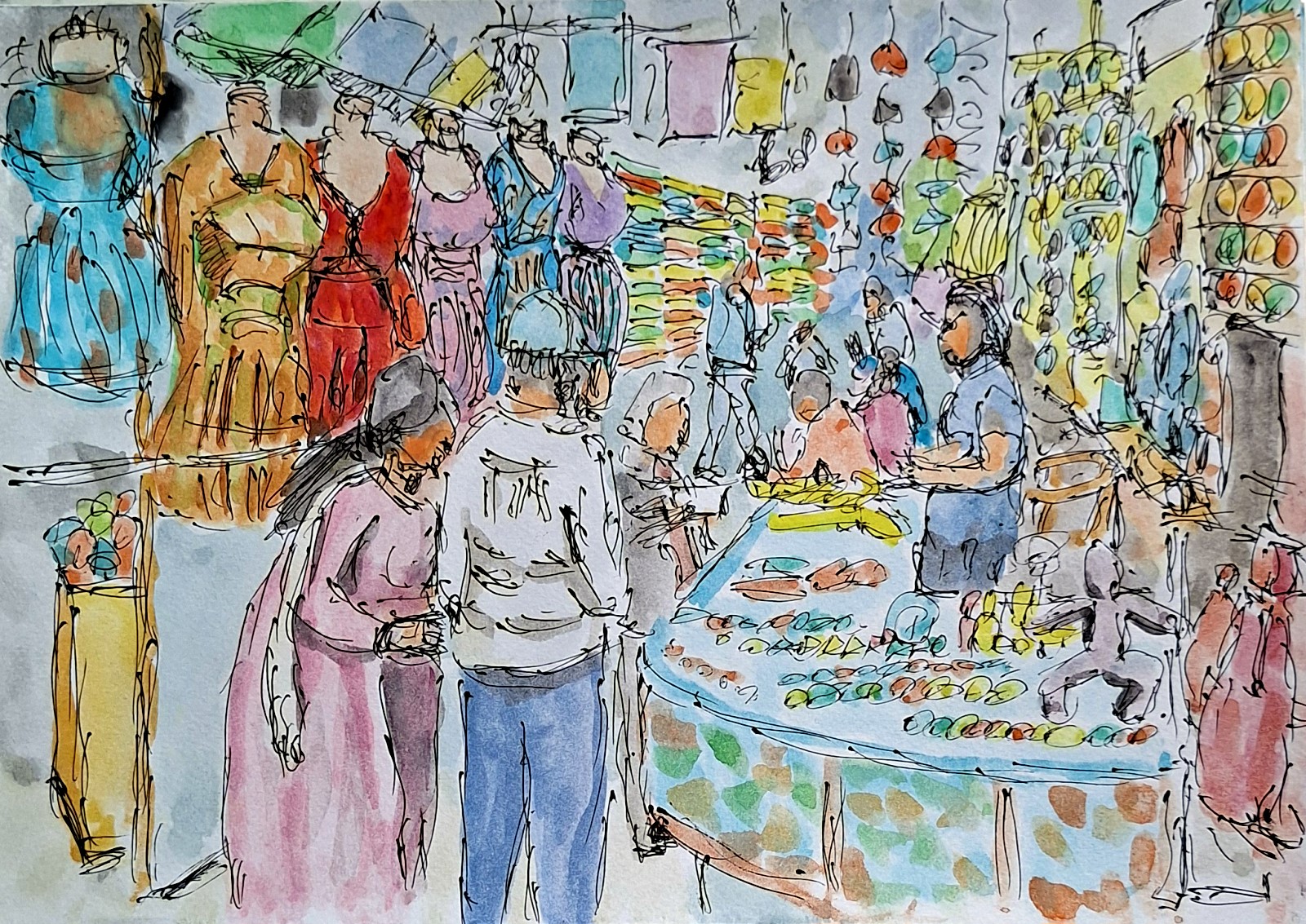 店內不大,卻是五彩斑斕的世界。架上摺疊著厚薄不一的絲巾、手工印染的被套、還有鑲著鏡片與金線的枕套。麗莎是當地女人,膚色深、笑容燦爛,她一邊熟練地整理布料,一邊跟客人用半英半印地語交談。她說這些布料多半來自村落裡的婦女合作社,每一塊都是手工印花,沒有兩塊完全一樣。