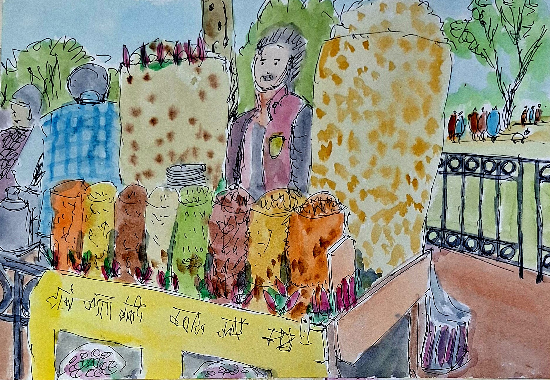 清晨的新德里街頭,空氣裡混合著塵土、香料與陽光加熱柏油的氣味。在一條不算寬的街道轉角,一輛老舊的手推車靜靜停著,上面堆滿五顏六色的糖果與餅乾,像一座微型的甜點山。透明 塑膠袋裡裝著金黃色的餅乾、裹著糖霜的圓形點心,還有用亮銀色紙張包起來的糖果,在光線下閃閃發亮。