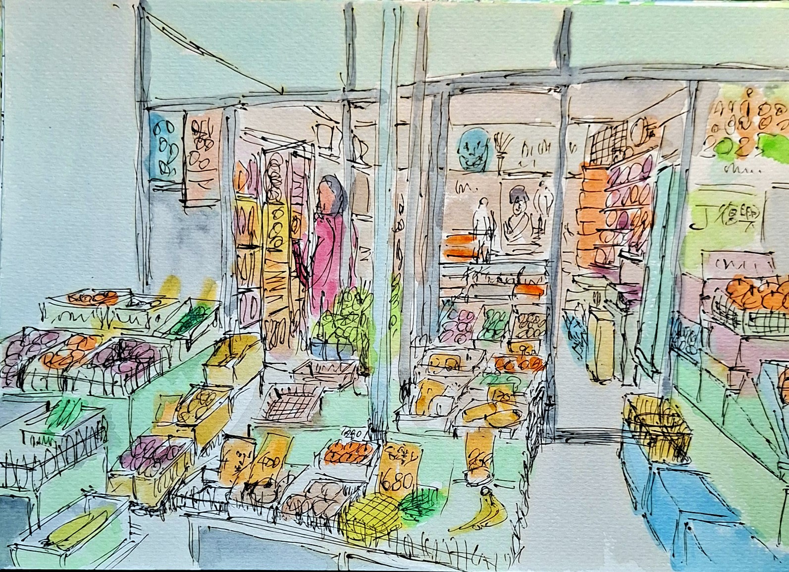 店外的街道行人稀少,腳步聲在柏油路上顯得清晰。對面居酒屋開始亮起燈,傳來碗盤碰撞的聲音,形成一種即將進入夜晚的節奏。水果店像是一個白天與夜晚的交界點,守著白日的勞動,也目送夜生活的開始。