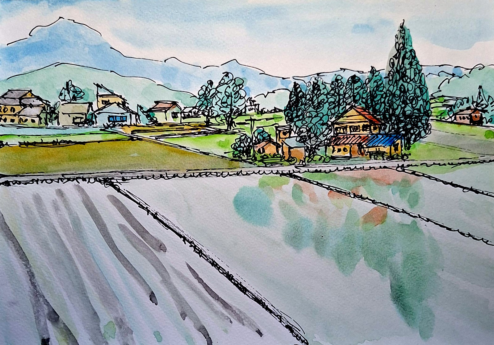 農舍零星散落在田野邊緣,深色木造的屋簷下,曬著工具與雨後未乾的靴子。沒有急促的人聲,只聽見風穿過稻葉的沙沙聲,以及遠處不知名鳥類短促的鳴叫。電線桿筆直地立在路旁,黑線橫越天空,為這片自然景色添上一點人為的秩序。