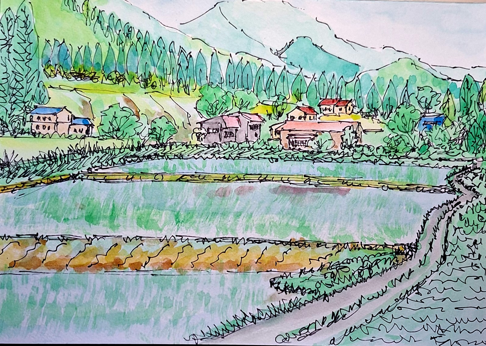 這裡的美不張揚,卻耐看。田野沒有喧嘩,卻盛滿生活的重量。收筆之際,我才發現手心微濕——不是汗,是這片土地的濕潤,悄悄滲進了畫裡。