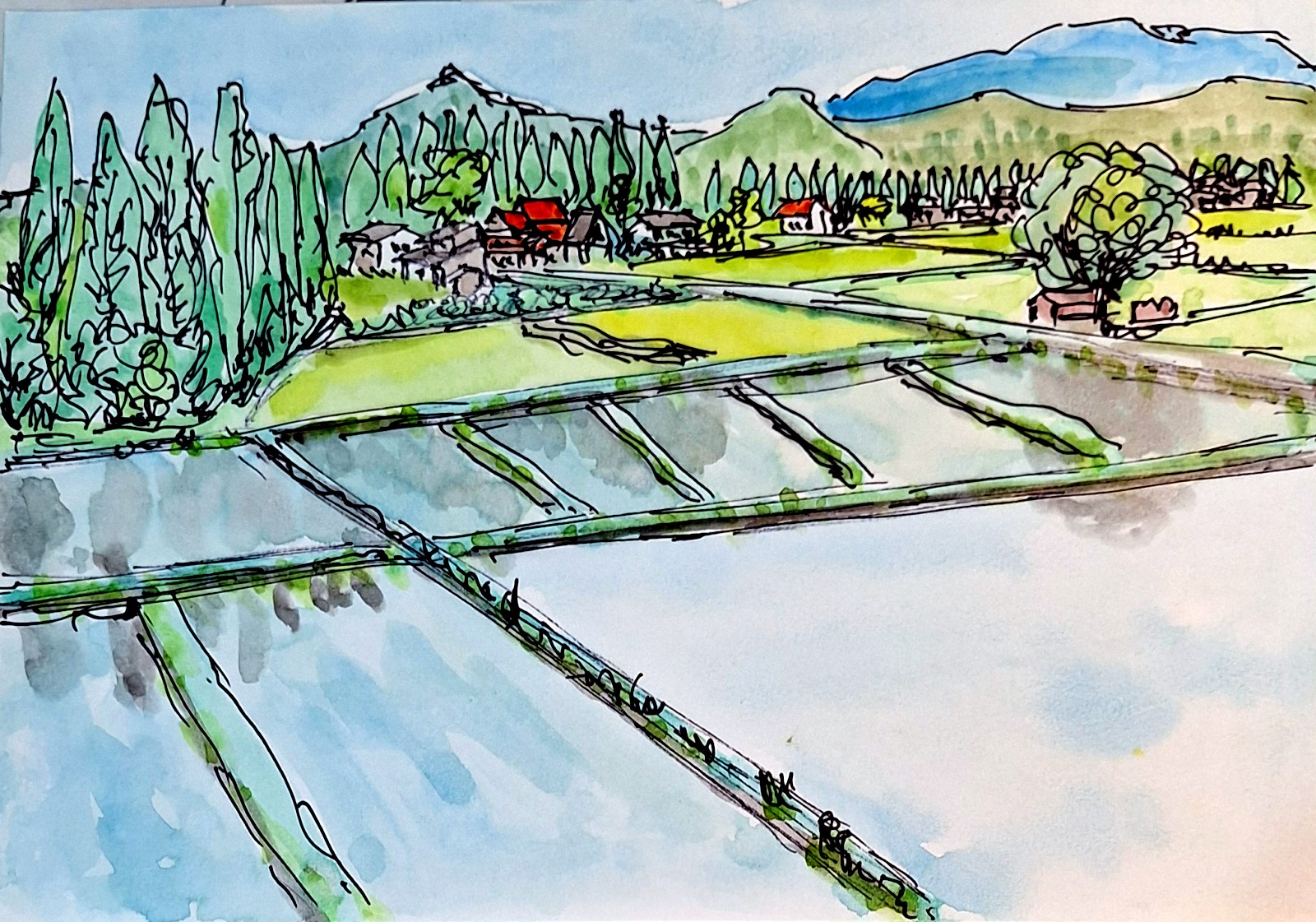 月台旁,是一片低矮的民宅與農田。秋田的天空很高,雲走得很慢,彷彿不急著趕路。遠方的山巒披著淡淡的霧氣,像老人坐在那裡靜靜守望。偶爾有風掠過,帶來稻穗與木頭混合的氣味,淡淡的,卻讓人安心。