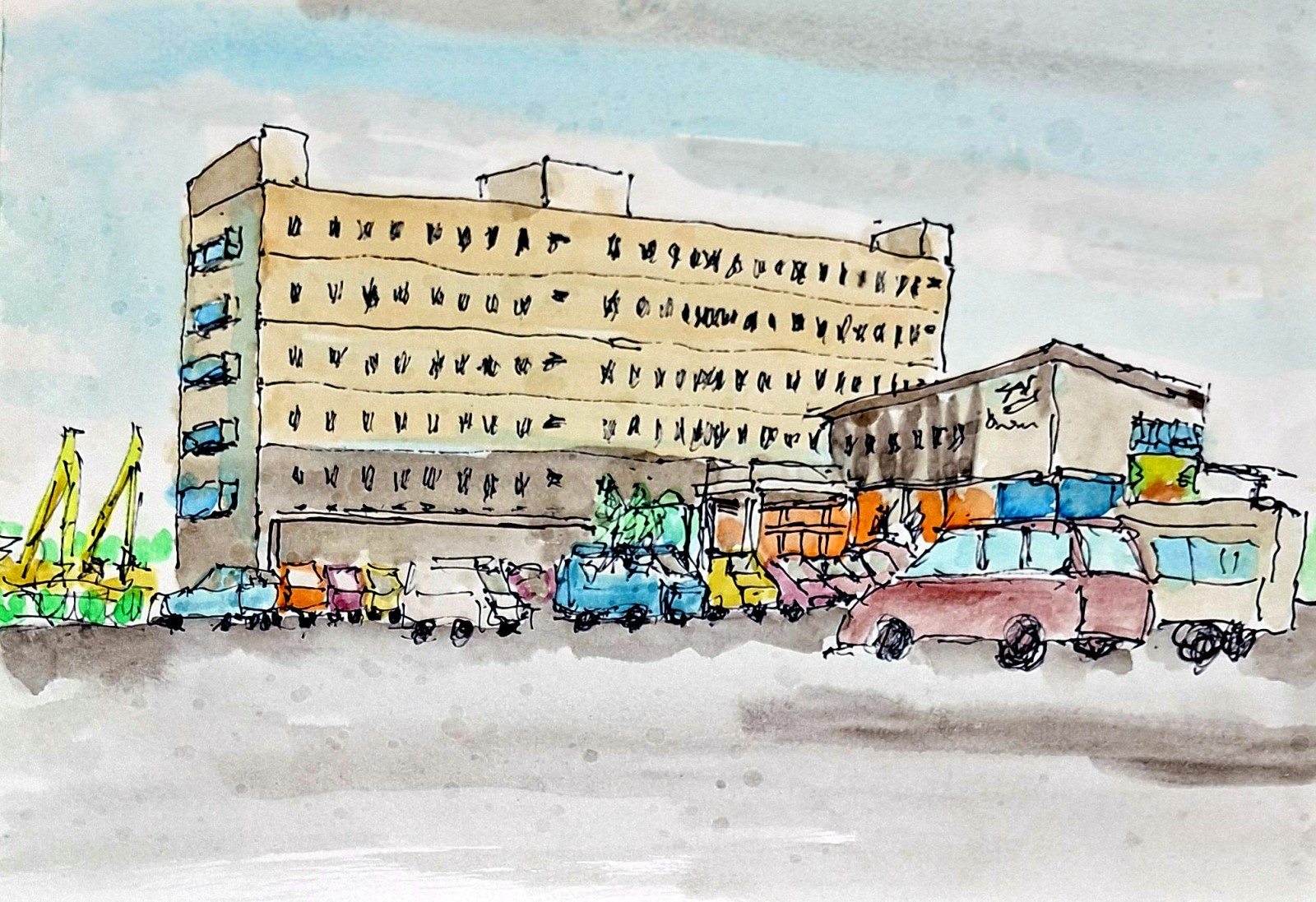 遠處是港口的起重機與停泊的船隻,近處則是旅館乾淨俐落的外觀,兩者形成一種微妙的對比。站在一旁速寫時,可以感受到風帶著海的鹹味掠過,筆下的線條也變得更為簡潔直接,彷彿呼應著這座建築本身的現代語言。