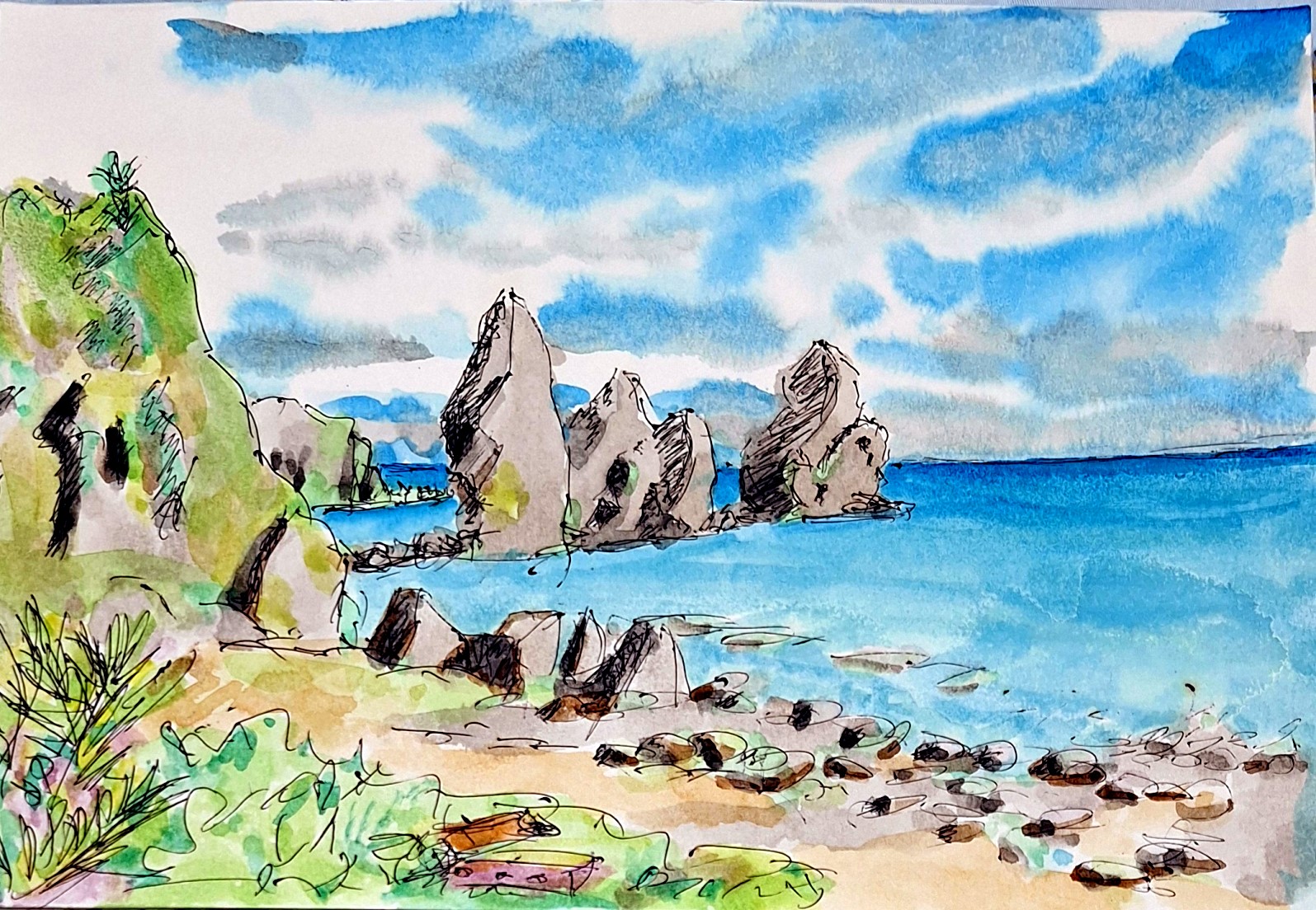 速寫的過程其實更像是一種對話,我與眼前的景物之間沒有語言,卻能感受到彼此的存在。當最後一筆落下,我抬頭再看將軍岩,突然覺得畫中的它只是片段,而真正的它,早已融入這片海與天空之中,靜靜地,守著時間的流動。