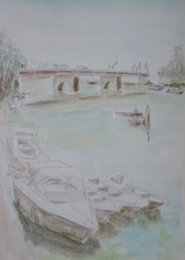 這是靠出海口的愛河邊上畫的, 過了橋就是星光碼頭, 可以看到許多情侶來來往往, 可我喜歡小船, 用淡淡的彩代表它們的存在.