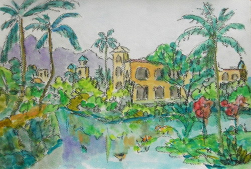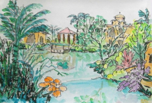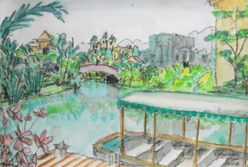 這是間不錯的飯店, 休閒渡假的氛圍佈置, 好似在佛羅里達的海邊, 也是這種建築模式, 建築圍繞著小湖建構, 坐在窗邊戶戶都可以有水景, 加上熱帶植栽耶子樹, 搖呀搖的, 人就不自覺的清爽起來,使人來了還想再來, 只是時間不許可, 只能多畫幾張下來留念囉!!