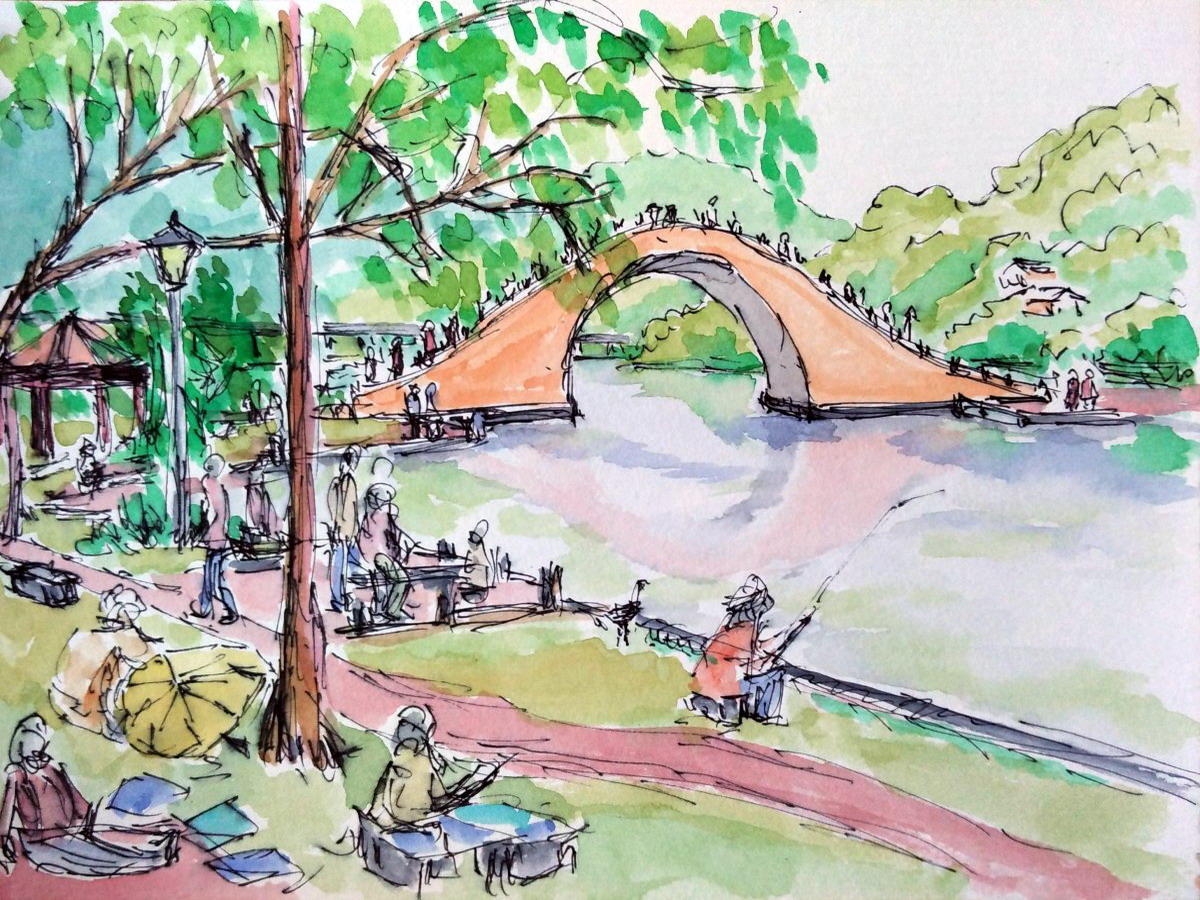 遠望拱橋加上倒影極美, 這會風大倒影消失無蹤.