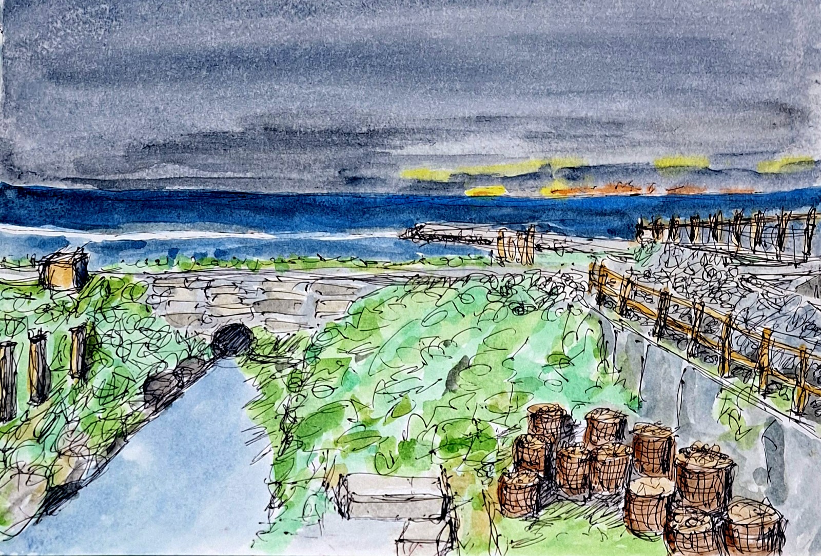 海風帶著鹹味,從遠方一陣一陣地吹來。我站在坡地上,望著那座佇立在島上高處的綠島電信發射塔,它不像風景的一部分,反而像一根突兀卻又不可或缺的線條,硬生生插入這片自然之中。 我拿出速寫本,試著用最簡單的線...