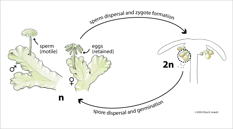 地錢 liverwort (Marchantia polymorpha) 屬苔綱 (Hepaticae),配子體呈綠色扁平塊狀。底部有假根,能進行無性生殖及有性生殖。 u 無性生殖--葉狀體(thallus),背面生胞芽杯(gemma cups),杯內生胞芽(gemma)進行繁殖,利用胞芽進行無性生殖,胞芽成熟後脫落,在泥土中發芽成新的配子體。 u 有性生殖--雌雄異株,各於直立有柄傘狀構造上為有藏精器之雄器柄(antheridiophores)有藏卵器之雌器柄(archegoniophores),藏精器製造精子,藏卵器製造卵子。精子以水作為媒介游往藏卵器內授精。受精卵在藏卵器內發育成孢子體 。孢子體的孢蒴產生孢子。孢蒴成熟後裂開將孢子釋放。在適當的環境下,孢子萌發成原絲體再發成配子體。 參考 http://www.ied.edu.hk/has/bio/dlo/moss/moss2c.htm ; http://oregonstate.edu/dept/nursery-weeds/weedspeciespage/liverwort/liverwort_page.html |