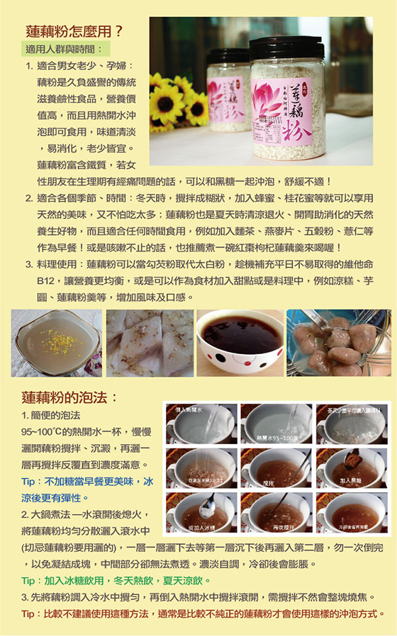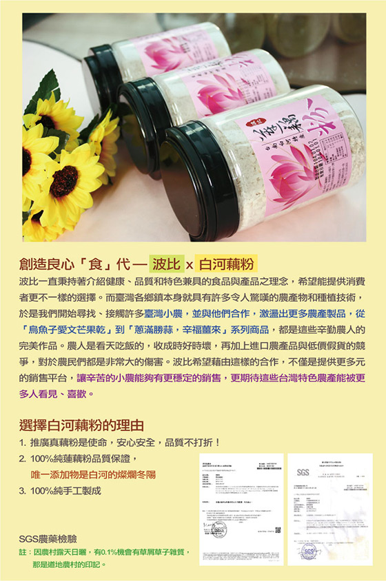 商品訊息簡述: 平均每瓶最低只要325元起(含運)即可購得台南白河100%純蓮藕粉1瓶/2瓶/4瓶/8瓶。