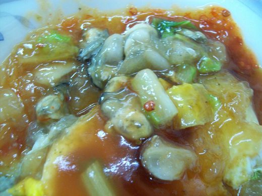 走到一家餐廳,點了蚵仔煎、蘿蔔糕,