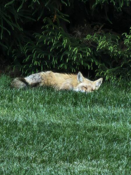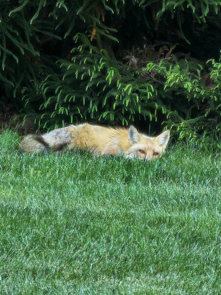 又一天,我正凝神看著窗外,思索如何與這炎夏抗爭,眼角餘光突然撇現一束紅影。一隻奇特的鳥在太陽的烈焰下飛到我家陽台上。這是一隻會唱歌的漂亮紅雀。那悅耳的聲音穿過緊閉的窗戶,吸引了我。也許是不習慣高熱,紅雀並未久留。而後,我的關注卻轉移到後院的薔薇樹蔭下。那兒躺著一隻狐狸,如此放鬆,一副慵懶自在,旁若無人。旁邊樹叢中有兩隻小松鼠正開心地玩著捉迷藏的遊戲。在右側不遠處則躺著一頭大公鹿,和一頭母鹿。它們都在學習如何在酷暑下生存。