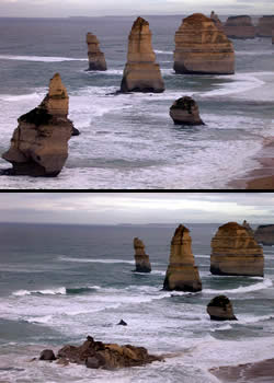 上面的第一張相片是另外一個有名的景點 - LONDON BRIDGE ,本來是與陸地聯在一塊的天然拱門,在1990年斷裂成目前這樣的景觀,斷裂當時,有兩位遊客還被困在另外一端,後來救援人員以直升機救出,12使徒巨岩(屬於PORT CAMPBELL N P 的一部份)附近的地形是由鬆軟的石灰岩所構成,由於南冰洋長期的海浪浸蝕,造成十分奇特的海岸景觀,但這些散落在浪濤中的巨石峭壁,能够屹立多久,就沒有人知道了。