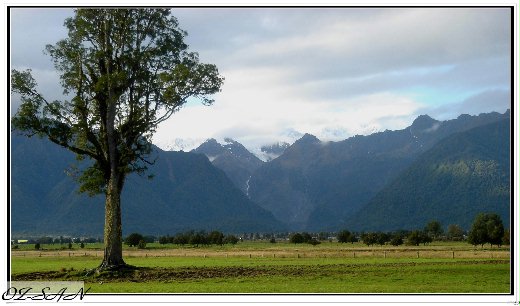 西岸的沿途沒有幾個大的鄉鎮,可以說是人煙稀少,往來的車輛也不多,但公路的路况相當良好,狹長的海岸線雖然曲折卻是平坦無什起伏,駕起車來輕鬆愉快,兩側的林相與東岸截然不同,蕨類植物像FERNTREE,GRASSTREE,棕櫚科不同種類的PALMTREE,生長快速的泡桐,合歡等,處處可見,頗有亞熱帶的氣息,岩岸的礁石多半是堅硬而黝黑的玄武岩所構成,海浪拍擊,激起了高高地白色浪花,攪拌了陰晦的海岸線,海面上偶有散落其中的礁岩,奇形怪狀,各異其趣,大夥兒加點想像力,就成了龜山島,成了三仙臺,石雨傘,猫鼻頭....,一路上說說笑笑的,也不怎麼寂寞,將近400公里的旅程,終於在下午快五點時,我們抵達 - FOX GLACIER - 福克斯冰河小鎮。