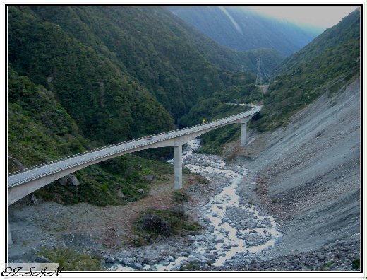 在基督城過了一夜,有了中橫的經驗,大夥兒那顆心就不那麽安份了,沒什麼好說的,一致决定用兩天的時間把北橫也"順道"走一趟,一早就跟著準備上班的車流上了7號公路,氣象報告可沒說今天也放睛,綿綿細雨一路相隨,進入山區內更是一片朦朧,這條北橫隔著不遠,就會有一個毛利人的聚落,掠過車窗兩旁,盡是青翠的岡巒與綠草如茵的牧場,煙雨中透露著黃樺紅楓,如詩如畫,一點也不寂寞。