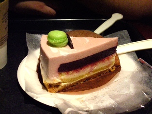 喝下大杯抹茶那提之後,這濃濃的抹茶粉味道和甜甜的熱牛奶香氣把我薰昏了!雖然吃到奶蛋類容易腸胃過敏也就不管那麼多,總比純咖啡來得好(有段時間只喝黑咖啡,後來才戒掉),儘管已經練成無糖神功,然而甜甜地像一般的熱奶茶,很容易就接受了。點了一塊莓子抹茶蛋糕當點心,是很可愛的粉紅色,甜品吃在嘴裡,不管什麼壞心情都會被融化!最高興的是收到姐姐送的生日禮物,是一條垂著橢圓蛋面紫石墜的銀項鍊,這個晶石稱作蘇俱來石,有一只銀台座,乍看之下顏色很接近黑色,原本擔心鍊子可能不夠長,因為我比較喜歡垂墜的戴法,不能接受被短鍊子繫住脖子,會覺得像被綁住或勒住頸子,姐姐建議不如就試戴看看?一戴之下,非常合適。