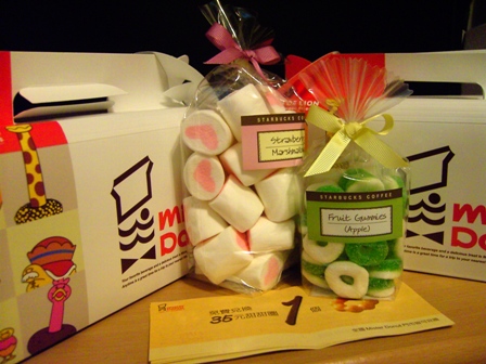 回到家開電腦,就看到好友說了一些事,看到盒子上那只松鼠尾巴被畫成甜甜圈,不禁想到也許這一切都是怨念造成的(啥?),知道她為了人生追愛大事,可能要面臨財務緊縮,就說「那我就把這七張免費券送妳吧!我也沒什麼財力,就當作我一點微薄的支持,給妳當免費點心!」而且袋子上有寫啦「宛如戀愛般甜蜜的滋味」~(歡迎對號入座XD)