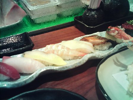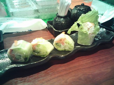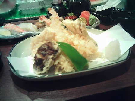 和阿姨到這間店吃飯,因為預約的頗早,所以店裡客人還不多,我們就坐在吧台。這間店單價不很高,可以算是居酒屋類的店家,我比較喜歡這樣的用餐氣氛。讓老板推薦菜單,因為兩個人食量都不大,所以採取點完再追加的方式,點了生菜捲、握壽司(十貫)、天婦羅,湯品和熱茶是附送的,湯料很豐盛,有菇類、野菜等。最後因為還感到有一點點餓,就追加鮭魚炒飯一份,兩個人分著吃也就吃得非常滿足了。