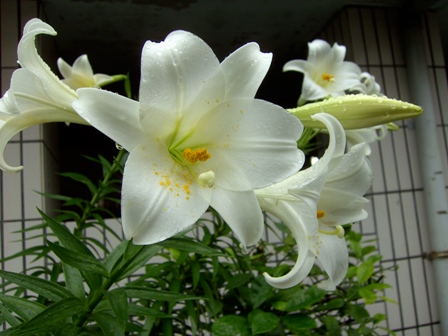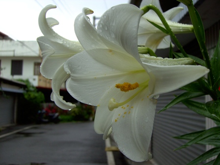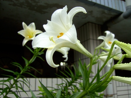 發現巷子裡有戶人家有百合,就馬上拿了相機對準它,因為我非常喜歡百合花。我喜歡的花有梅、櫻、藤、蓮、鳳凰木、鳶尾花、孤挺花、桃花、彼岸花(曼珠莎華)、百合、紫陽花、牡丹、薔薇、鈴蘭、山茶(樁)、水仙、木棉花、姊妹草、含笑花(因為是自己的英文名字)、扶桑花、木瓜花、梔子花、風信子、海棠、杏花、瞿麥,大抵我會喜歡的花要不是成花瓣多數集中呈現團狀、串狀,就是花瓣很細小,或者一枝之上造型類似炸開一樣的(百合科植物多半是),以前讀的女中,到校門前的坡道上也有台灣山百合,不知道現在還在不在,株數極少。