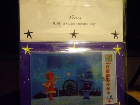 *上面的照片是說木星接近地球,幾乎在月亮底下,試拍之後連月亮都變藍色,我又想到水樹奈奈的「blue moon」這首歌……,下面是以七夕為主題的悠遊卡,原本還在考慮要不要買,因為大家都說很醜,可是我不知道為什麼很喜歡這個機器人系列,我好像缺搖呼啦圈的那張,兩個機器人面對面卻還是得用話筒顯得很可愛,上面那一句日文是這麼寫的:月が囁く君の秘密を解き明かしに行く(去向月兒打聽妳/你對它說的秘密悄悄話)。