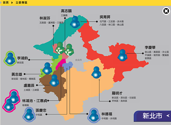 該平台可以讓您清楚的看到各區域、各政黨立法委員的分佈狀況和他的責任區域,請點擊畫面進入: 選民可以查閱到自己選區的立法委員的詳細資料,例如,個人簡介、競選政見、提案表現、與論報導、質詢表現、被遊說紀錄和整體政績分析報表等,請點擊畫面進入。 選民可以就各項法案,來查詢立委的表決紀錄,請點擊畫面進入。接下來,還可以任選兩名立委的政績做量化比較,單立委對比立法院的整體績效比較,以及單立委對比立法院委員會的整體績效比較,請點擊畫面進入。