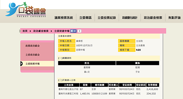 下圖,為政治獻金檢索系統,請點擊畫面進入: 下圖,為立法委員財產申報查詢政系統,請點擊畫面進入:《 口袋國會 》
