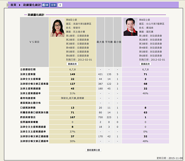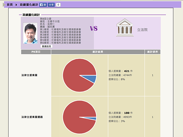 下圖,為單一立委對比立法院的整體績效比較範例,請點擊畫面進入。