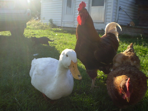 早上,不過是看著雞、鴨、貓全部聚在門口討食,心念一轉發了這一頓牢騷,供你吃供你住還要當你們的奴才,三年來動物互有消長,沒有一隻進到我們肚子,羊群已近五十,禽類只剩這隻長命鴨和一公二母幸福雞,老大累的問我,明年他上大學後怎麼辦,老婆累的問我:「你玩夠了嗎?」。