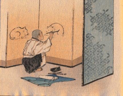 無論【屏風裡的少女】或是【畫貓的男孩】皆蘊含弄假成真的意義。前者希臘神話,等等皆有類似題材;後者,則較為特出。在下就將本故事的大意說明。有一位貧苦卻聰慧的小男孩,被父母送進寺院,向住持修習佛法,也有棲身之所。小沙彌的悟性極高,人也很乖巧,不過、卻有個小小的毛病:到處畫貓。住持開始時也睜一隻眼閉一隻眼,到最末按耐不住,將他趕出寺院。臨去時,助還是給他忠告:【過夜時,要到小地方,別呆大地方。】總之,小沙彌來到村莊,荒廢的大宅院,忘記了住持的教誨。等到驚覺,怪物已悄悄上門。翌日早晨,小沙彌平安無事;定睛一看,一隻鼠怪倒於血泊。發生什麼事?不得而知。但那牆上,小孩畫的貓,嘴角留著泊泊血跡~~~~~。