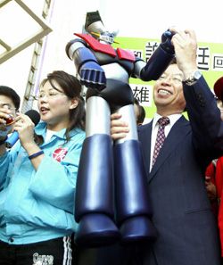 行政院長謝長廷昨天返回高雄市三鳳中街,市議員陳信瑜(左)送他「無敵鐵金剛」玩偶,要他「越挫越勇」。