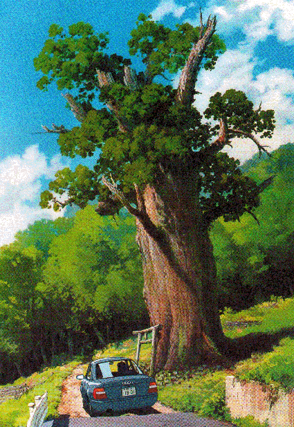 來說說這圖片,住台灣的朋友是不是覺得若干眼熟?不知道、宮崎駿先生是不是參考【阿里山神木】?此場景除了左右顛倒、以及汽車與火車的區隔,簡直就是阿里山標準觀光照的翻版。不過呢、想來看的朋友可能要失望,神木已於公元一九九九年傾倒,倒下的樹幹靜靜的躺在鐵軌的一側。磅礡氣勢、仍可略見一二。