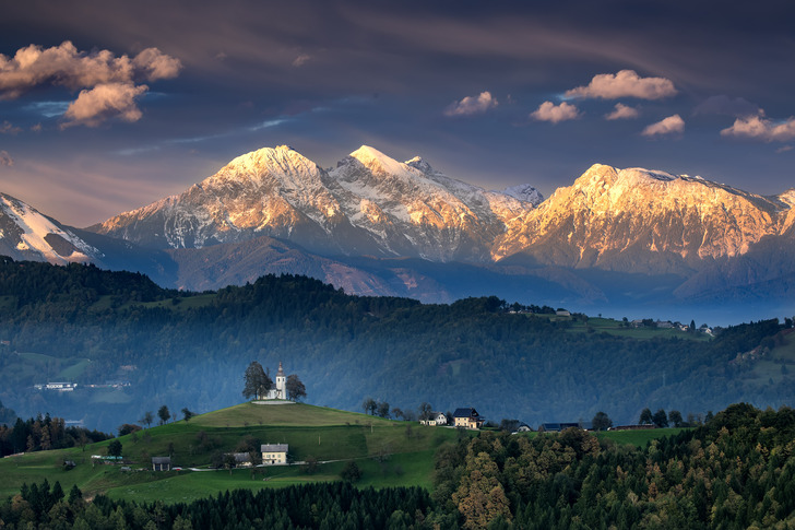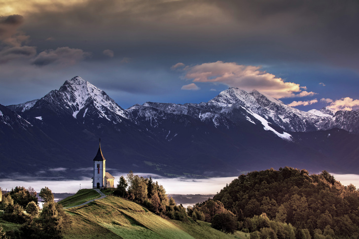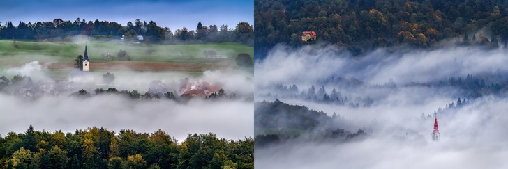 太陽出來後我們就往教堂的方向走去,在途中左右兩側山谷都瀰漫著雲霧,這時發現遠處有兩座教堂在雲霧中若隱若現,趕快拿出長鏡頭來拍攝,邊走邊拍每一個角落都好美。最後在Jamnik教堂前合照留念,早上麵包只是暫時充飢,回程前往超市採買了早餐還有今天的晚餐的材料。