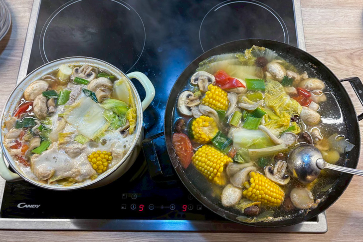 阿香在切玉米時還把人家的砧板搞壞,還想說不能當作不知道就混過去嗎? 我覺得還是要誠實以告,就寫了訊息給房東請他原諒我們粗魯的行為,看看我們該如何補償。不一會兒房東回訊息給我(其實他就住在樓下而已) ,要我們不用在意,還跟我們說明早退房不用趕,中午12:00前退房即可,真是Nice的房東,一定要給好評。 兩大鍋開吃拿出台灣帶的沙茶醬、醬油、辣醬、當沾料,真的太好吃了啦,很快就掃光見底了。