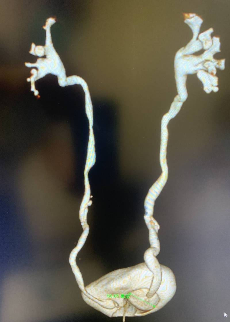 沈元琦表示,輸尿管囊腫從尿道口外翻脫垂從外觀不易辨認,若沒有正確診斷,很容易誤以為是膀胱或子宮脫垂,經電腦斷層檢查才診斷出是輸尿管囊腫從尿道口外翻脫垂的罕見案例。