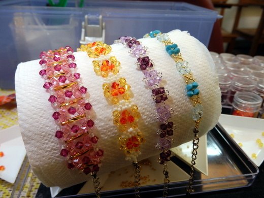 昨天把串珠拿來起做,這活果然是個安定情緒,提高專注力的好方法,越做越起勁,就做完四條啦!四條不同風格,不同色調,不同小珠的手鍊,排排看,真有成就感,耶!