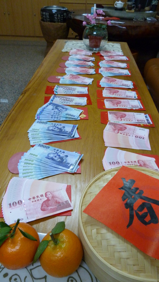 [壓歲錢]又稱為[過年錢],古時候是用紅線將一百個銅錢串起來,拿到的人表示可以長命百歲。現在是將紙幣(因為銅板已無法滿足時代的需求了),放進紅包袋內。在除夕夜全家吃團圓飯時,由家中長者分發給小孩壓歲,祝福其長命百歲。當然紙幣一定要取其2、6、8、0之雙數,表吉利。